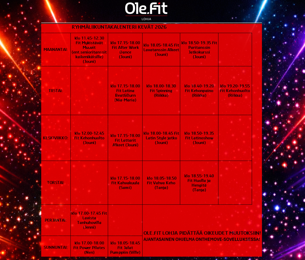 Ole.Fit Lohjan ryhmäliikuntatunnit tuovat energiaa ja elinvoimaa arkeesi! Meillä voit nauttia monipuolisista ja mukaansatempaavista tunneista, jotka on suunniteltu kokonaisvaltaisen hyvinvoinnin edistämiseksi.